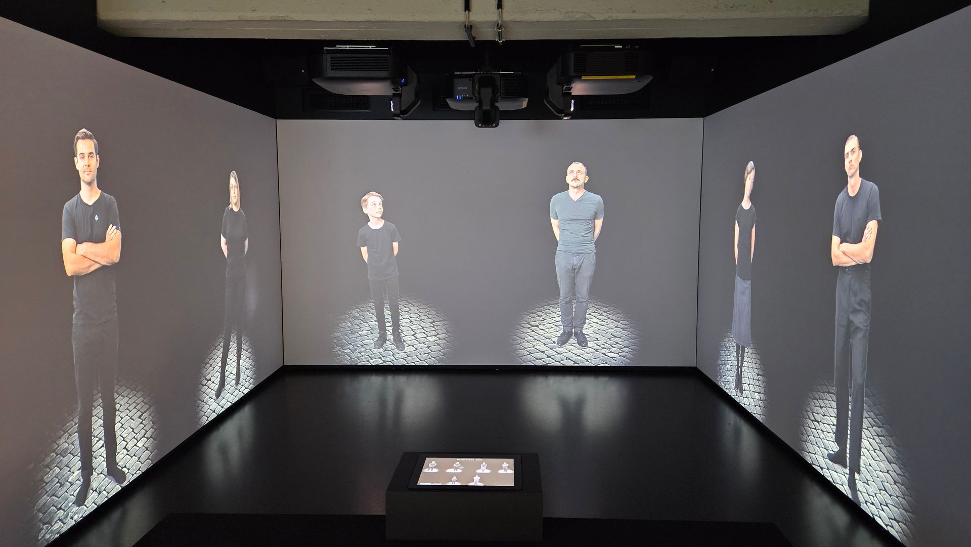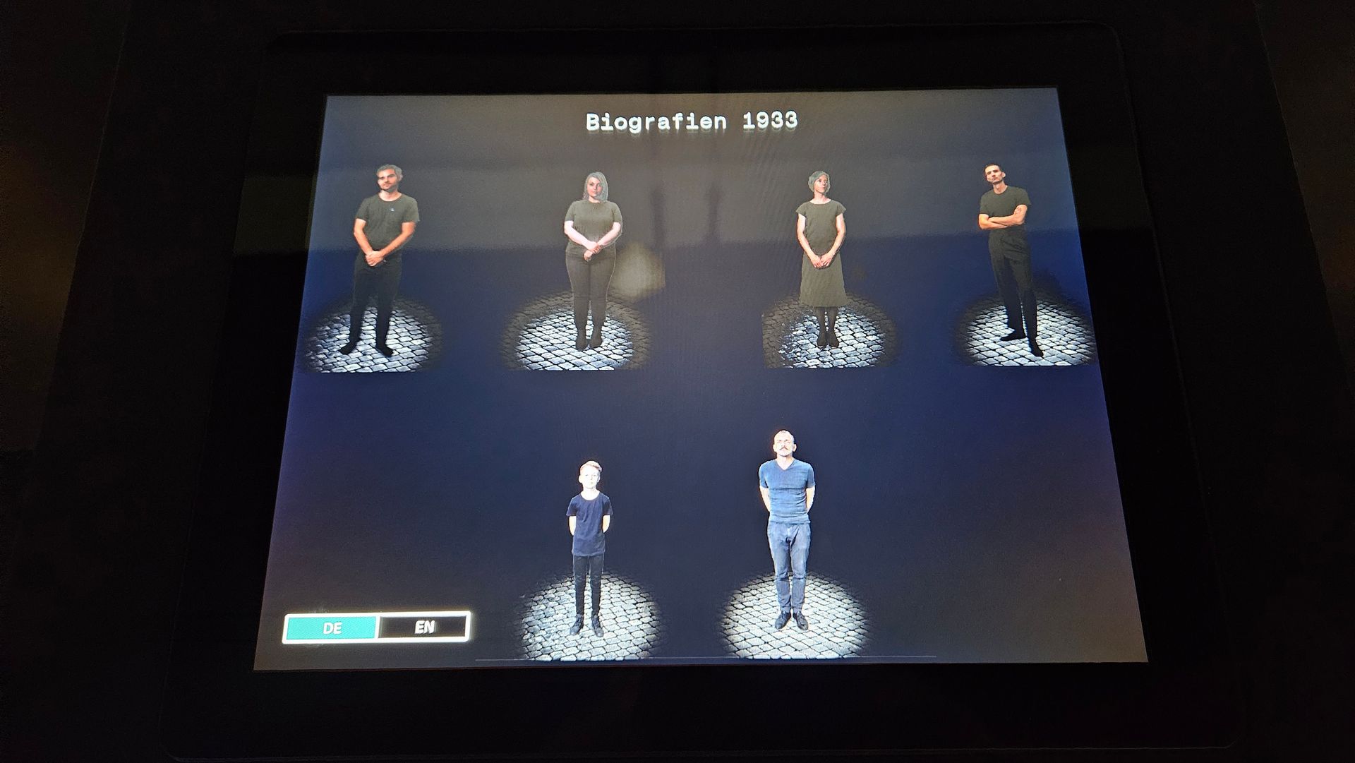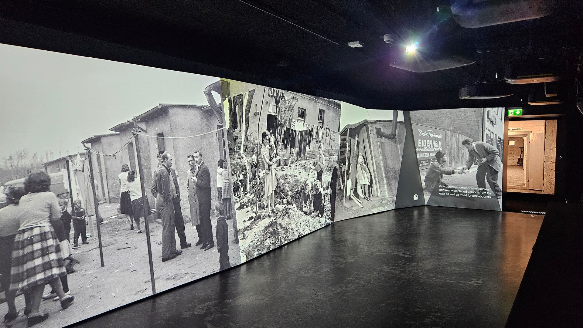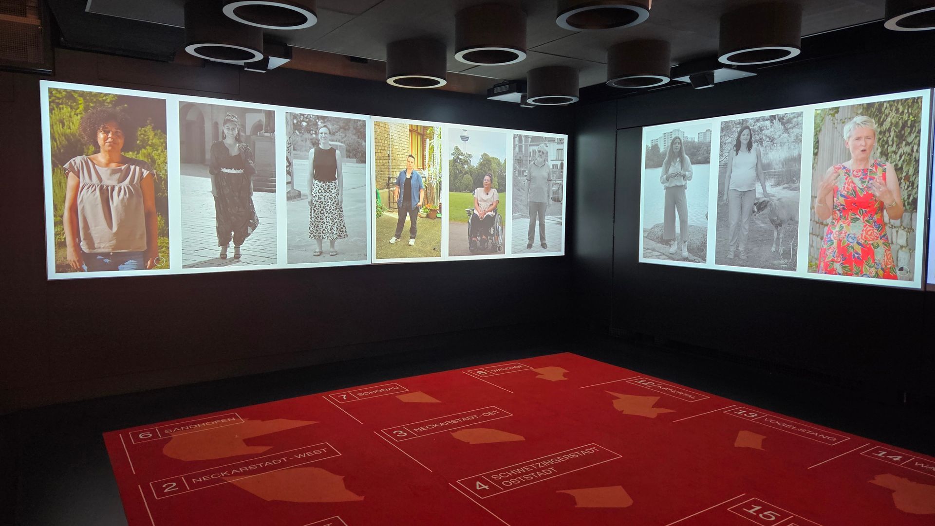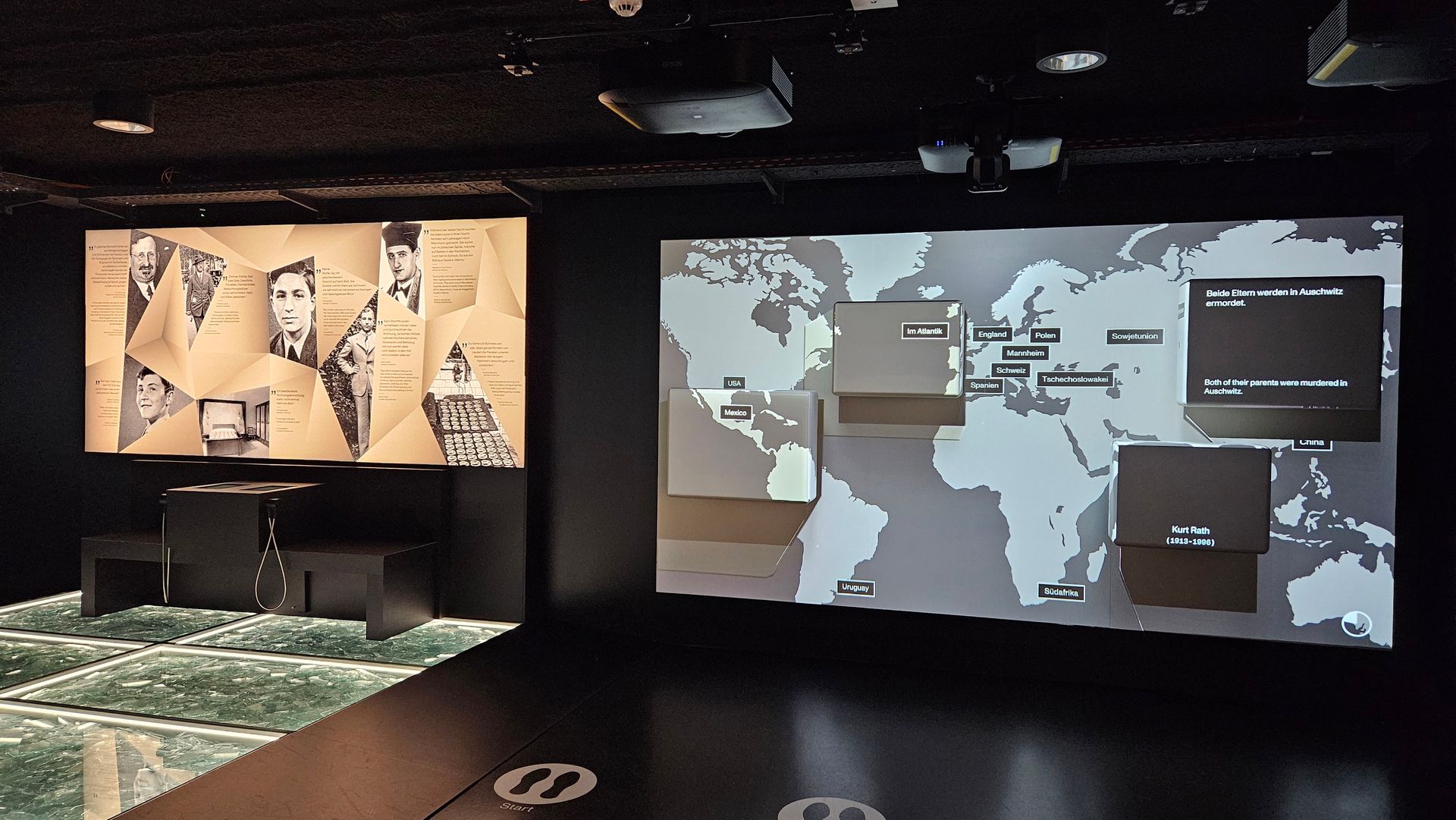 Die Ausstellung zur NS-Zeit in Mannheim arbeitet an mehreren Stellen mit immersiven Projektionen. Die Räume sind schwarz gestrichen. Zahlreiche Touchscreens ermöglichen es, verschiedene Themen teilweise in drei Vertiefungsebenen zu recherchieren. Die Informationsdichte ist sehr hoch. An einer Station kann man Biografien von sechs Zeitzeugen auswählen. Die Texte werden von SchauspielerInnen, die auch im Bild agieren, gesprochen. Originalfotos, Filmausschnitte und Plakate auf den drei umschließenden Projektionswänden ziehen die Besucher ins Geschehen. Die Schicksale sind so persönlich und emotional erzählt, dass wir uns ihnen kaum entziehen können.