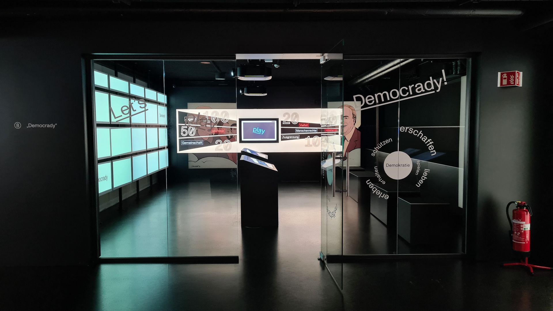 Am Ende der Ausstellung gibt es einen Quiz-Raum “Democrady!” in Anlehnung an Jeopardy. Zwei Teams können gegeneinander antreten. Auf einer Monitorwand können Fragenbereiche ausgewählt werden. Dabei geht es um demokratische Werte. Dieser Quiz-Raum ist besonders für das jüngere Publikum interessant, da der Wettkampf dazu motiviert, alle angebotenen Inhalte aufzurufen und dazu Stellung zu nehmen.